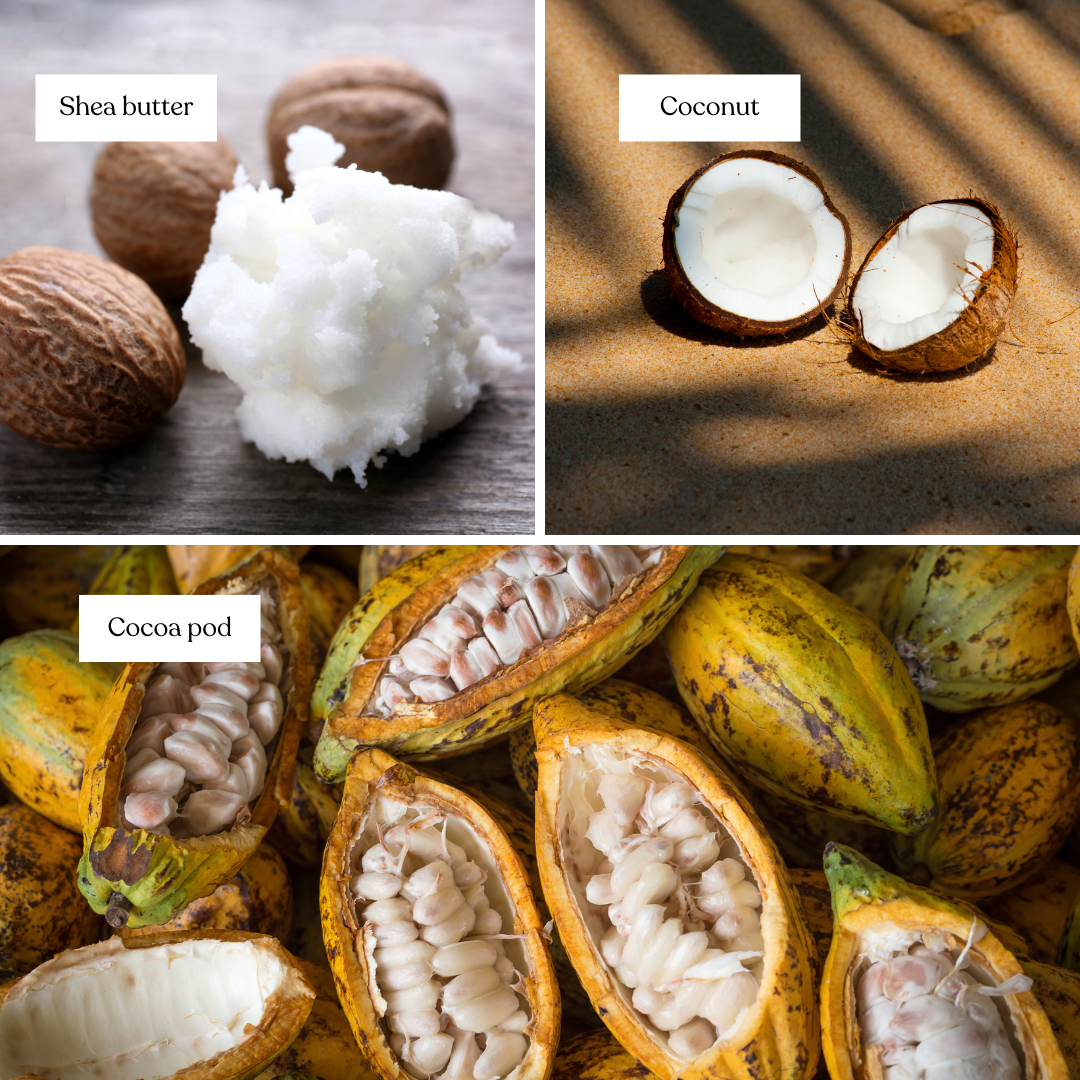 Please note there is cocoa pod ash in our soaps, but during the saponification process the cocoa pod ash (potassium hydroxide) turns to Glycerin.